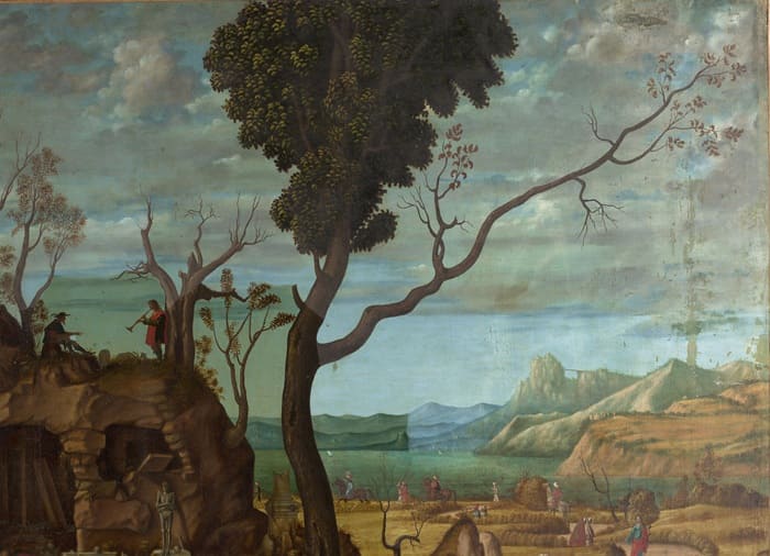 “The Preparation of Christ’s Burial” is a remarkable and enigmatic work. Instead of the more common lamentation, the painter chose the moment between Christ’s death on the cross and his resurrection: In the center of the painting, Christ’s body lies in state; behind it, the tomb is being opened, and Joseph of Arimathea is preparing to wash the body. Leaning against a tree is an old man in meditation, presumably Job, an Old Testament forerunner of Christ. Numerous narrative details, set within an idealized landscape, emphasize the contrast between life and death: skulls and skeletal remains in the foreground, and shepherds playing music in the center of the painting.