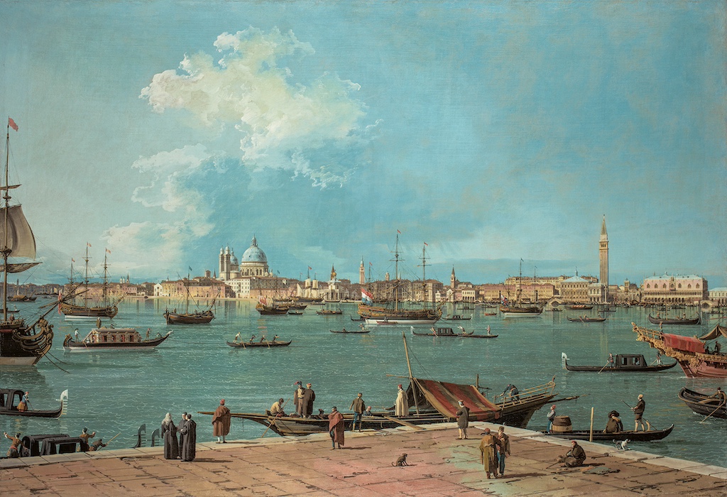 Im Europa des 18. Jahrhunderts erfreuten sich gemalte Stadtansichten (auf Italienisch »vedute«) großer Beliebtheit. Vor allem britische Aristokratie suchte auf ihren Bildungsreisen (der »Grand Tour«) nach bildlichen Souvenirs von wichtigen Reisezielen, insbesondere Venedig. Unter den venezianischen Malern, die diesen Markt bedienten, prägte Antonio Canal (1697–1768), bekannt als Canaletto, das Bild der Stadt wie kaum ein anderer. Als Kind eines Theaterbühnenbildners verband er optische Genauigkeit mit malerischer Fantasie, um die einzigartige städtische Umgebung Venedigs in eine idealisierte Bühne zu verwandeln. Ob er nun geschäftige Kais und Kanäle oder die zeremonielle Barke des Dogen – die Bucintoro – während ihrer jährlichen Prozession zur Adria zeigte, seine Gemälde präsentieren Venedig als kulturelles Ideal republikanischer Tugend, Seemacht und zeremonieller Pracht. Seine Kompositionen waren sehr begehrt, und Zeitgenossen bemerkten, dass sie eine solche Leuchtkraft besaßen, als würde das Sonnenlicht selbst aus ihnen herausstrahlen.