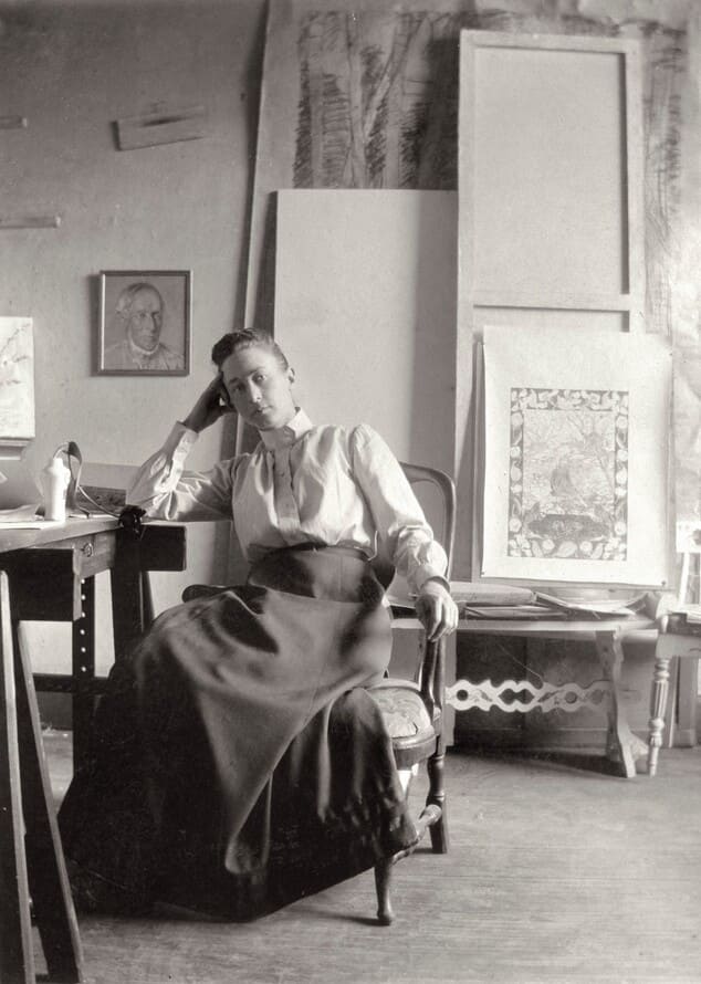 Trained at the Royal Swedish Academy of Fine Arts, Hilma af Klint led a double artistic life: a conventional one with traditional figurative works, and a secret one with a resolutely avant-garde production. Influenced by her involvement in the Theosophical Society, she drew the freedom of her inspiration from séances held within a group of women with whom she shared the same utopian vision. Spirals, circles, and radiating forms reflect a search for cosmic harmony and the invisible forces that govern the world, giving her works a universal and timeless dimension. Hilma af Klint chose not to reveal her abstract work to her contemporaries and stipulated in her will that her works should remain sealed for twenty years after her death, which contributed to the delayed recognition of her work. It was not until 1986, during the exhibition The Spiritual in Art: Abstract Painting 1890–1985 in Los Angeles, that her abstract paintings were presented to the general public for the first time, marking the beginning of her international renown.